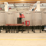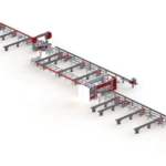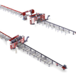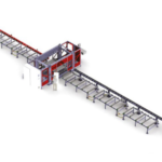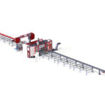 Затем, подающее устройство перемещает обработанную балку на ленточную пилу (опционально). Распил производится на любую, заданную длину и угол (-45 / + 60 «). Готовые заготовки, после операций сверления и резки помещаются на выходной конвейер.