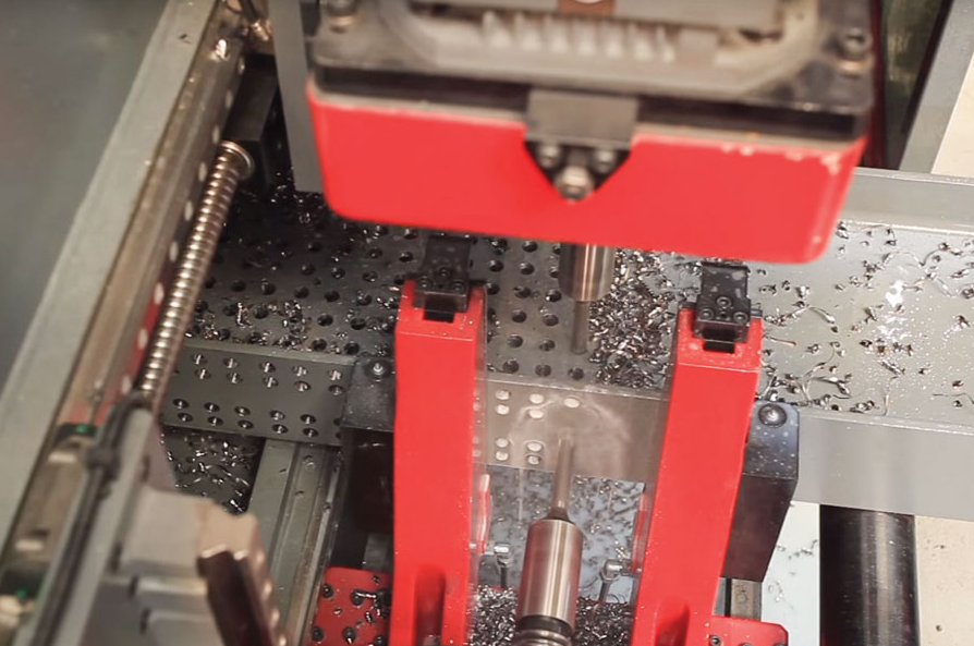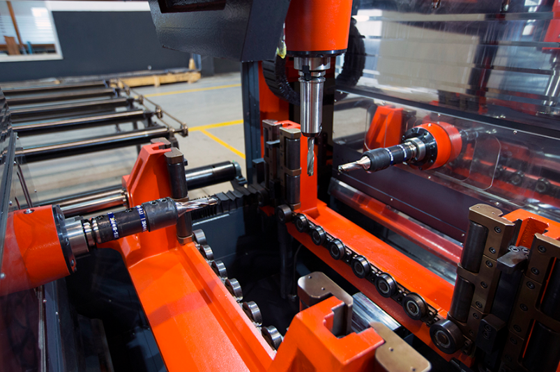 Профиль может обрабатываться без продвижения балки на длину в 500 мм. Например, если диаметр отверстий составляет 10 мм, а расстояния между отверстиями — 40 мм, шпиндель способен просверлить 12 отверстий без перемещения балки, а это означает, что вы можете сэкономить много времени в ходе операции.