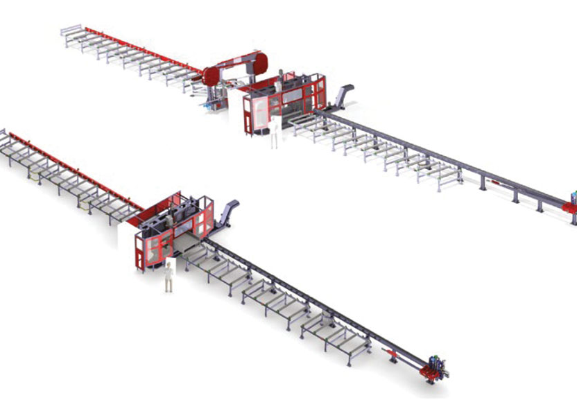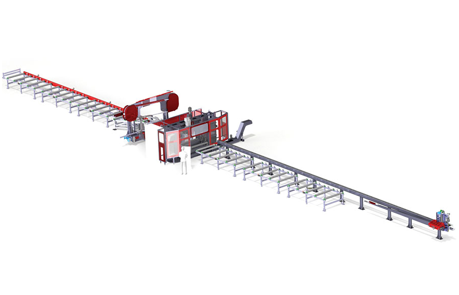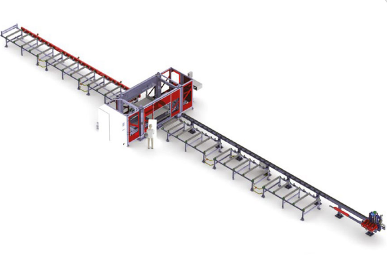Затем, подающее устройство перемещает обработанную балку на ленточную пилу (опционально). Распил производится на любую, заданную длину и угол (-45 / + 60 «). Готовые заготовки, после операций сверления и резки помещаются на выходной конвейер.