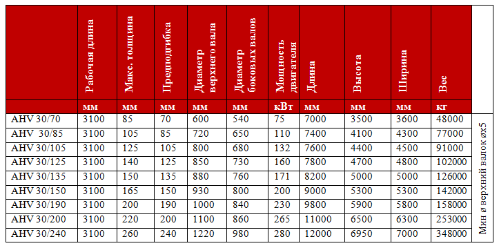 Модель AHV сочетает в себе мощность и производственную гибкость благодаря своей конструкции с изменяемой геометрией. Три валка в моделях AHV движутся независимо друг от друга. Необходимые геометрические положения для широкого круга заготовок обеспечиваются благодаря вертикальному перемещению верхнего валка и независимому горизонтальному перемещению боковых валков.