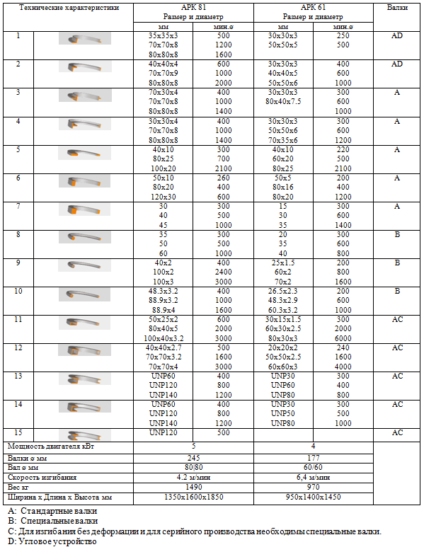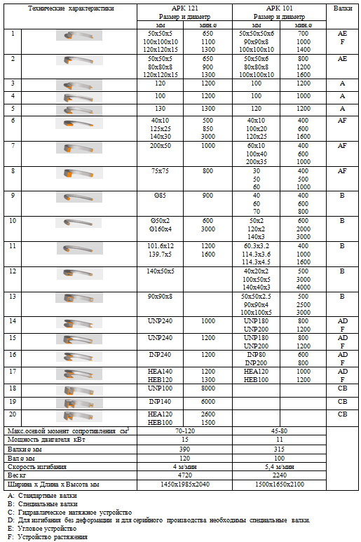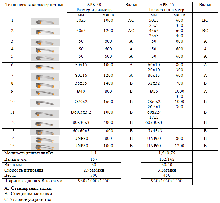 СТАНДАРТНЫЕ ХАРАКТЕРИСТИКИ ПРОФИЛЕГИБОЧНОГО СТАНКА МАЛОЙ МОЩНОСТИ АРК 45, 50: