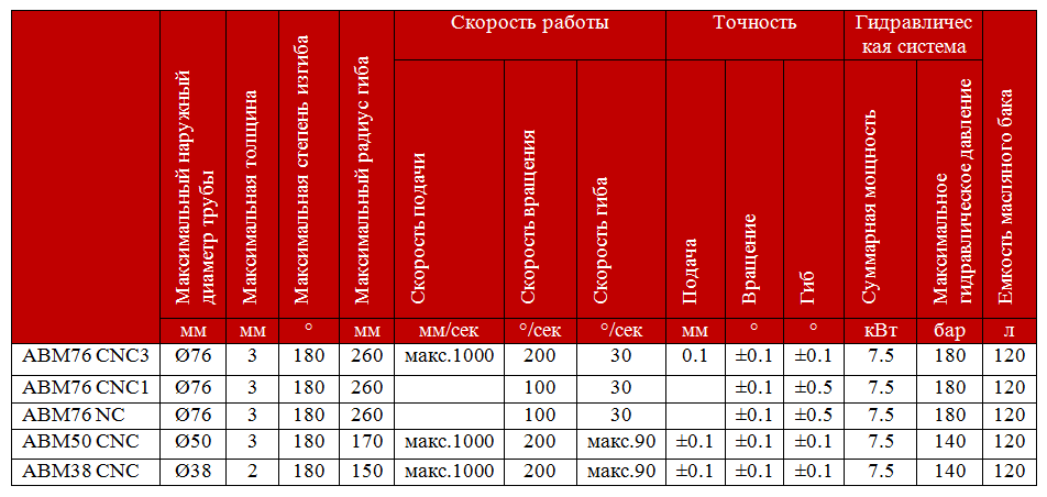 Трубогибочный станок ABM 76 CNC-1 может гнуть трубы диаметром до 76мм. Данный станок с сервоуправлением обеспечивает возможность использования трех линий оснастки, так же может осуществлять процесс гибки труб автоматически, тем самым сокращая потери времени и увеличивая производительность.